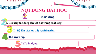 II. Độ lớn của lực đẩy Archimedes. III. Luyện tập. IV. Vận dụng. KHỞI ĐỘNG