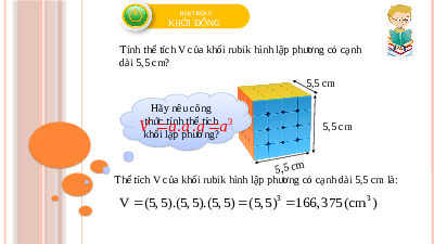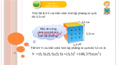 Thể tích V của khối rubik hình lập phương có cạnh dài 5,5 cm là: 3 3 V ( 5,5).(5,5).(5,5) ( 5,5) 166 ,375(cm )