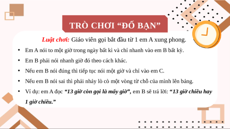 • Ví dụ: em A đọc “13 giờ còn gọi là mấy giờ”, em B sẽ trả lời: “13 giờ chiều hay