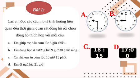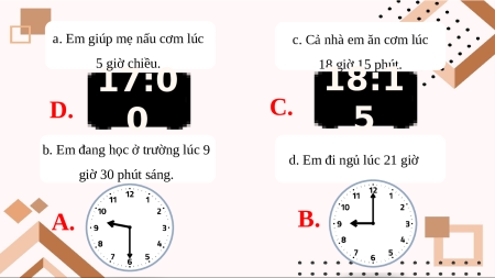 b. Em đang học ở trường lúc 9 d. Em đi ngủ lúc 21 giờ giờ 30 phút sáng. A. B.