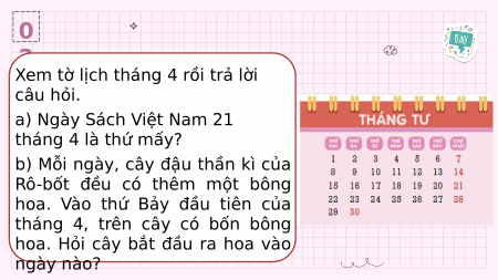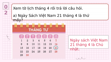 Xem tờ lịch tháng 4 rồi trả lời câu hỏi. a) Ngày Sách Việt Nam 21 tháng 4 là thứ mấy?