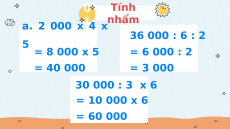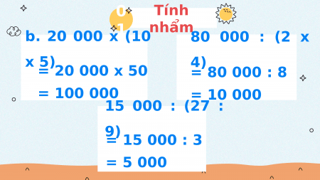 LUYỆ N TẬP 0 Tính 1 nhẩm a. 2 000 x 4 x 36 000 : 6 : 2 5 = 8 000 x 5 = 6 000 : 2 = 40 000 = 3 000 30 000 : 3 x 6 = 10 000 x 6 = 60 000 0 Tính 1 nhẩm b. 20 000 x (10 80 000 : (2 x x 5) 4) = 20 000 x 50 = 80 000 : 8 = 100 000 = 10 000 15 000 : (27 : 9) = 15 000 : 3 = 5 000