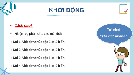 + Đội 3: Viết đơn thức bậc 5 có 4 biến.