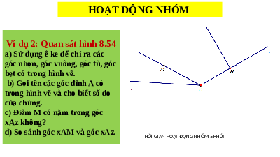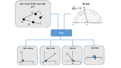 Góc và yếu tố liên quan đến Đo góc góc b aSb = 75° A y ∙ ∙ M ∙ O x ∙ B a S GÓC Góc vuông Góc nhọn Góc tù Góc bẹt x x x ∙ x O ∙ y O∙ y O∙ y O y Ví dụ 1: