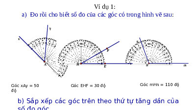 a) Đo rồi cho biết số đo của các góc có trong hình vẽ sau: y y x x n n F A H E m H m Góc xAy = 50 Góc EHF = 30 độ Góc mHn = 110 độ độ