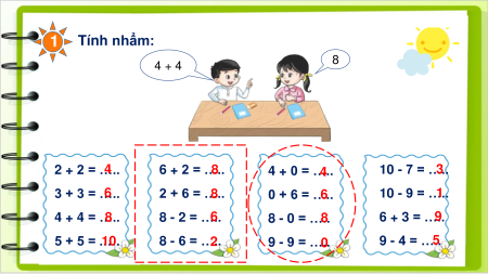 Bài 35: Luyện tập chung – Tiết 1 LUYỆN TẬP 1 Tính nhẩm: 8 4 + 4 2 + 2 = ….. 4 6 + 2 = ….. 8 4 + 0 = ….. 4 10 - 7 = ….. 3 3 + 3 = ….. 6 2 + 6 = ….. 8 0 + 6 = ….. 6 10 - 9 = ….. 1 4 + 4 = ….. 8 8 - 2 = ….. 6 8 - 0 = ….. 8 6 + 3 = ….. 9 5 + 5 = .…. 10 8 - 6 = ….. 2 9 - 9 = ….. 0 9 - 4 = ….. 5 2