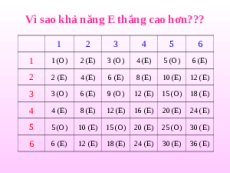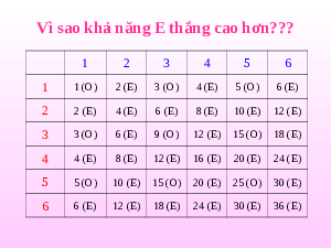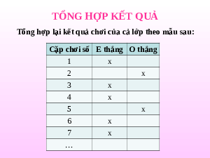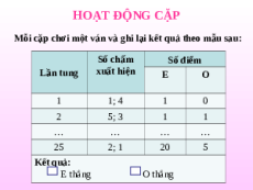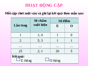Mỗi cặp chơi một ván và ghi lại kết quả theo mẫu sau: Số chấm Số điểm Lần tung xuất hiện E O 1 1; 4 1 0 2 5; 3 1 1 … … … … 25 2; 1 20 5 Kết quả: E thắng O thắng