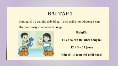 Phương có 12 con thú nhồi bông, Tú có nhiều hơn Phương 3 con.