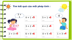 Tìm kết quả của mỗi phép tính : 5 1 3 + 4 1 4 + 1 = 5 5 + 1 = 6 … … 3 + 2 = 5 4 + 2 = 6 … … 2 + 3 = 5 6 + 0 = 6 0 + 5 = 5 1 + 3 = 4 … … … …