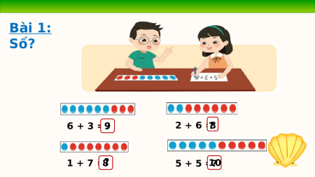 TOÁN 1 Tuần 9 Bài 20: Luyện tập DỌN SẠCH ĐẠI DƯƠNG 2 3 1 4 Bài 1: Số? 6 + 3 = ? 9 2 + 6 = ?8 1 + 7 = ? 8 5 + 5 = ? 10