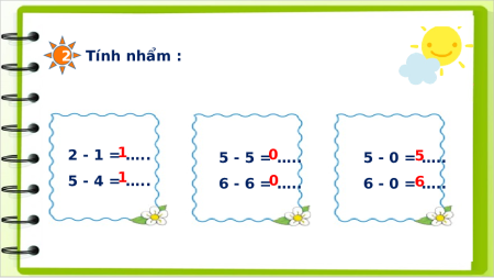 Tìm kết quả của mỗi phép tính : 3 - 2 1 2 Tính nhẩm : 2 - 1 = … 1 .. 5 - 5 = … 0 .. 5 - 0 = … 5 .. 5 - 4 = … 1 .. 6 - 6 = … 0 .. 6 - 0 = … 6 .. 3 Số ? ? ? 2 2 ?1 ?3 ?3 ?4