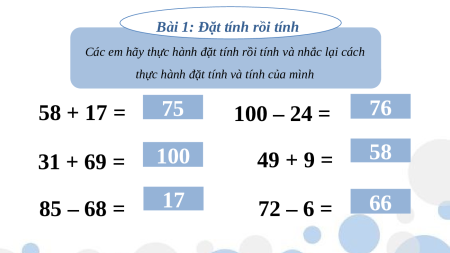thực hành đặt tính và tính của mình 58 + 17 = ? 75 100 – 24 = ? 76 31 + 69 = ? 100 49 + 9 = ? 58 85 – 68 = ? 17 72 – 6 = ? 66