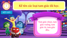 Kể tên các loại tam giác đã học. BẮ H T Ế T ĐGẦIU Ờ! Tam giác nhọn, tam giác vuông, tam giác tù, tam giác đều.