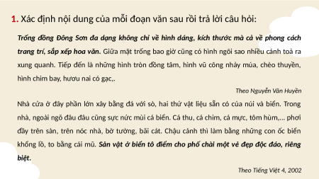 1. Xác định nội dung của mỗi đoạn văn sau rồi trả lời câu hỏi: