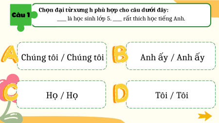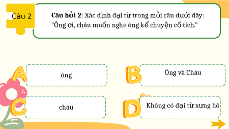 Ch n ọ đ i ạ t ừ x n ư g h phù h p ợ cho câu dư i ớ đây: ____ là h c ọ sinh l p ớ 5. ____ r t ấ thích h c ọ ti ng ế Anh. Chúng tôi / Chúng tôi Anh y / Anh ấ y ấ H / H ọ ọ Tôi / Tôi Câu 2 Câu h i 2 ỏ : Xác đ nh đ ị i t ạ tr ừ ong m i câu d ỗ i đ ướ ây: "Ông i, ơ cháu mu n ng ố he ông k chu ể y n c ệ tích. ổ " ông Ông và Cháu Không có đ i t cháu ạ x ừ ng hô ư
