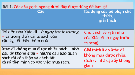 Bài 1. Các dấu gạch ngang dưới đây được dùng để làm gì?