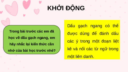 ĐẾN VỚI TIẾT HỌC MỚI KHỞI ĐỘNG Dấu gạch ngang có thể