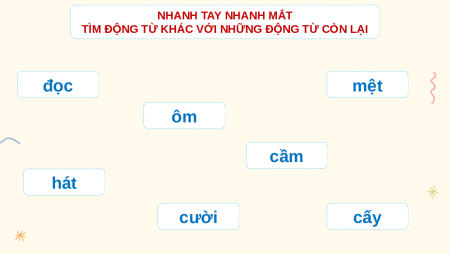 TÌM ĐỘNG TỪ KHÁC VỚI NHỮNG ĐỘNG TỪ CÒN LẠI đọc mệt ôm cầm hát cười cấy