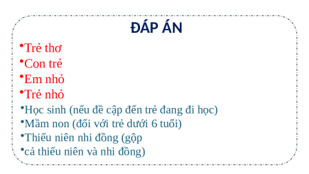 nhiều từ hơn thắng cuộc. ĐÁP ÁN •Trẻ thơ •Con trẻ •Em nhỏ •Trẻ nhỏ