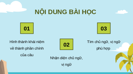 ĐẾN VỚI BÀI HỌC! TIẾT 3. THÀNH PHẦN CHÍNH CỦA CÂU NỘI DUNG BÀI HỌC 01 03 Hình thành khái niệm 02 Tìm chủ ngữ, vị ngữ về thành phần chính phù hợp của câu Nhận diện chủ ngữ, vị ngữ 01