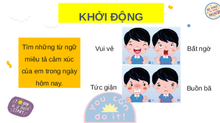 ĐẾN VỚI TIẾT HỌC MỚI KHỞI ĐỘNG Tìm những từ ngữ Vui vẻ Bất ngờ miêu tả cảm xúc của em trong ngày hôm nay. Tức giận Buồn bã Bài 21: