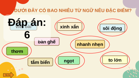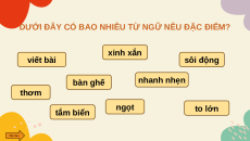 DƯỚI ĐÂY CÓ BAO NHIÊU TỪ NGỮ NÊU ĐẶC ĐIỂM? xinh xắn viết bài sôi động bàn ghế nhanh nhẹn thơm ngọt to lớn tắm biển Tiếp theo