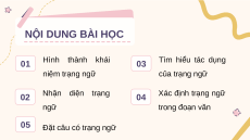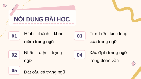 TIẾT 3. LUYỆN TỪ VÀ CÂU TRẠNG NGỮ NỘI DUNG BÀI HỌC 01 Hình thành khái 03 Tìm hiểu tác dụng niệm trạng ngữ của trạng ngữ 02 Nhận diện trạng 04 Xác định trạng ngữ ngữ trong đoạn văn 05 Đặt câu có trạng ngữ