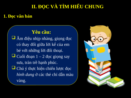II. ĐỌC VÀ TÌM HIỂU CHUNG 1. Đọc văn bản Yêu cầu:
