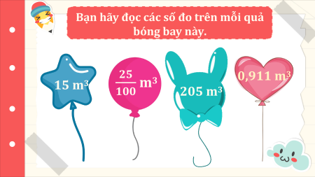 Bạn hãy đọc các số đo trên mỗi quả bóng bay này. �� 0,911 m3 15 m3 m3 ��� 205 m3