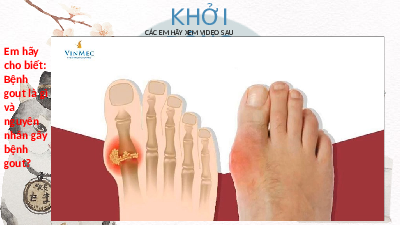 ĐẾN VỚI KHTN 8 KHỞI CÁC E ĐỘNG M HÃY XEM VIDEO SAU Em hãy cho biết: Bệnh gout là gì và nguyên nhân gây bệnh gout? BÀI 36: ĐIỀU HÒA MÔI TRƯỜNG TRONG CƠ THỂ NGƯỜI Nội dung