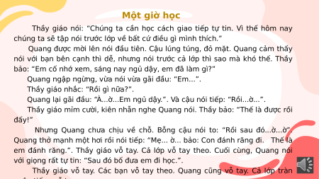 Nhưng Quang chưa chịu về chỗ. Bỗng cậu nói to: “Rồi sau đó...ờ...ờ”.
