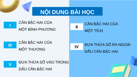 CĂN BẬC HAI CỦA SỐ THỰC NỘI DUNG BÀI HỌC CĂN BẬC HAI CỦA I CĂN BẬC HAI CỦA II MỘT BÌNH PHƯƠNG MỘT TÍCH CĂN BẬC HAI CỦA III IV ĐƯA THỪA SỐ RA NGOÀI MỘT THƯƠNG DẤU CĂN BẬC HAI V ĐƯA THỪA SỐ VÀO TRONG DẤU CĂN BẬC HAI