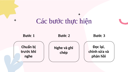 trả lời đúng (Ai trả lời đúng sớm nhất sẽ nhận được nhiều điểm nhất) Từ khóa Lắng nghe Kí hiệu Thuyết trình Ghi chép Tóm tắt Quan trọng Nói và nghe I. Quy trình thực hiện