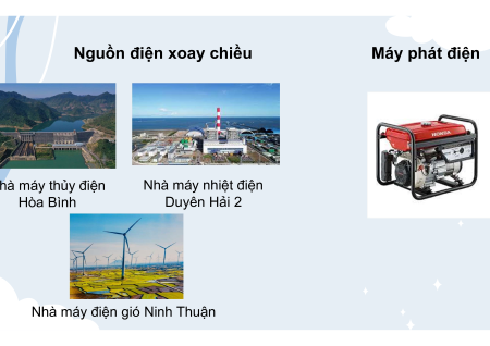 Hãy lấy ví dụ về nguồn điện mà em biết Nguồn điện một chiều Nguồn điện xoay chiều Máy phát điện Nhà máy thủy điện Nhà máy nhiệt điện Hòa Bình Duyên Hải 2