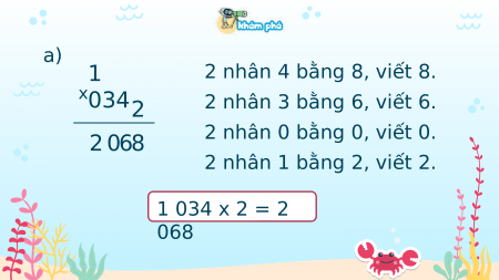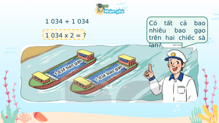 KHÁM PHÁ 1 034 + 1 034 Có tất cả bao nhiêu bao gạo 1 034 x 2 = ? trên hai chiếc sà lan? a) 1 2 nhân 4 bằng 8, viết 8. 0 x 342 2 nhân 3 bằng 6, viết 6. 2 8 6 0 2 nhân 0 bằng 0, viết 0. 2 nhân 1 bằng 2, viết 2. 1 034 x 2 = 2 068