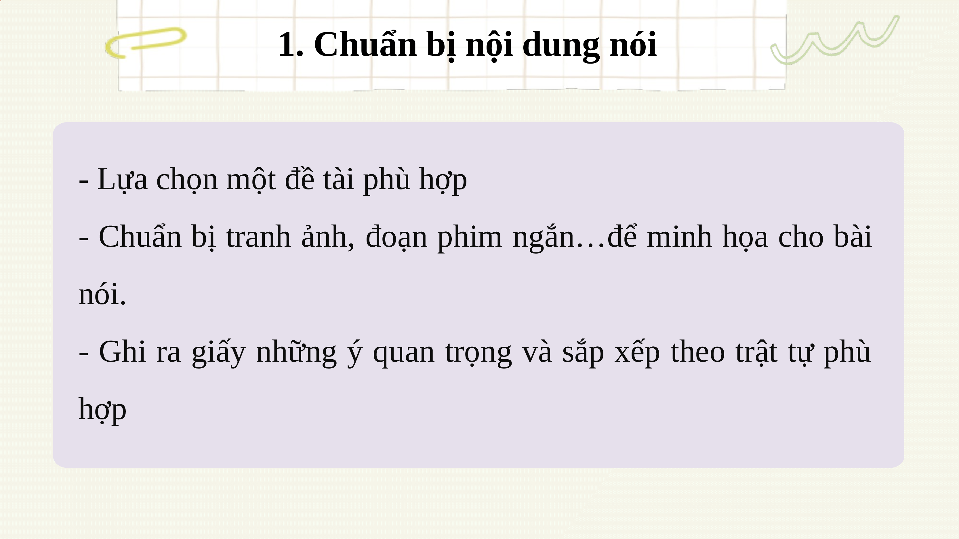 - Chuẩn bị tranh ảnh, đoạn phim ngắn…để minh họa cho bài nói.