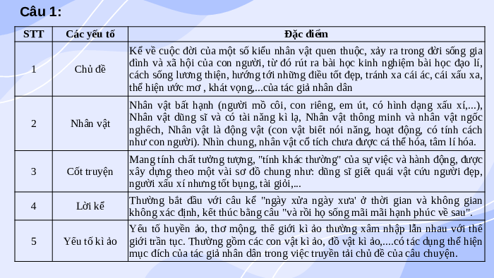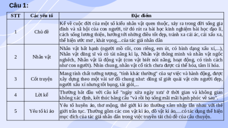 CỦNG CỐ, MỞ RỘNG Câu 1: STT Các yếu tố Đặc điểm