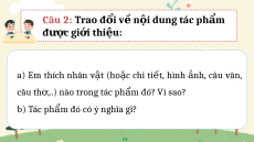 ệ (Hi-rô-nô-ri Na-ca-ga-oa) Câu 2: Trao đ i v ổ n ề i dung tác ph ộ m ẩ đ c gi ượ i thi ớ u: ệ a) Em thích nhân v t ậ (ho c ặ chi ti t ế , hình n ả h, câu văn, câu th ,. ơ .) nào trong tác ph m ẩ đó? Vì sao? b) Tác ph m ẩ đó có ý nghĩa gì?