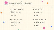 Tính giá trị của biểu thức: a) 731 – 680 + b) 63 x 2 : 7 19 = 51 + 19 = 126 : 7 = 70 = 18 c) 14 x 6 - 29 d) 348 + 84 : 6 = 84 - 29 = 348 + 14 = 55 = 362 0 2
