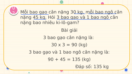 nặng 45 kg. Hỏi 3 bao gạo và 1 bao ngô cân nặng bao nhiêu ki-lô-gam? Bài giải 3 bao gạo cân nặng là: 30 x 3 = 90 (kg)