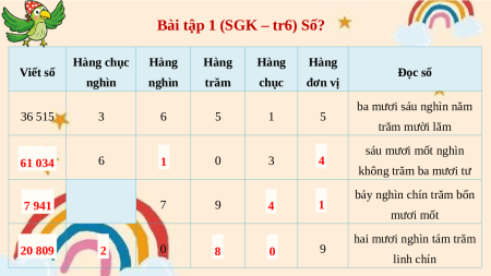 Bài tập 1 (SGK – tr6) Số? Hàng chục Hàng Hàng Hàng Hàng Viết số Đọc số nghìn nghìn trăm chục đơn vị ba mươi sáu nghìn năm 36 515 3 6 5 1 5 trăm mười lăm sáu mươi mốt nghìn ? 61 034 6 ?1 0 3 ? 4 không trăm ba mươi tư