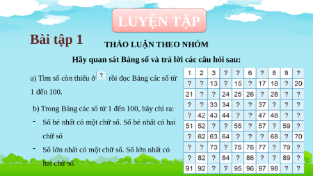 a) Tìm số còn thiếu ở rồi đọc Bảng các số từ 1 đến 100.
