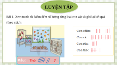 Bài 1. Xem tranh rồi kiểm đếm số lượng từng loại con vật và ghi lại kết quả (theo mẫu):