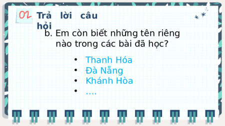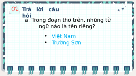 a. Trong đoạn thơ trên, những từ ngữ nào là tên riêng? • Việt Nam • Trường Sơn Trả lời câu hỏi