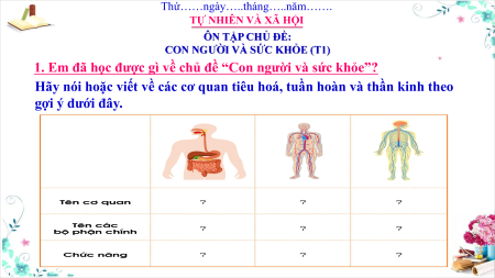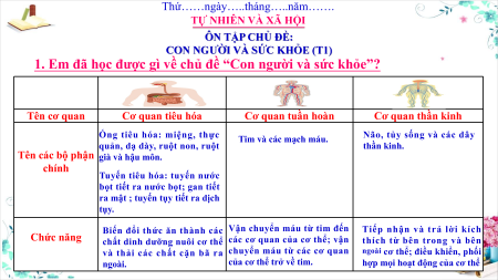 1. Em đã học được gì về chủ đề “Con người và sức khỏe”? Tên cơ quan Cơ quan tiêu hóa Cơ quan tuần hoàn Cơ quan thần kinh