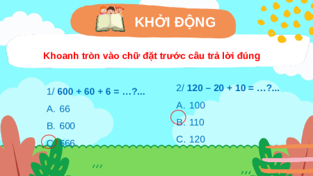 2/ 120 – 20 + 10 = …?... A. 66 A. 100 B. 600 B. 110 C. 666 C. 120