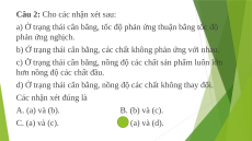 d) Ở trạng thái cân bằng, nồng độ các chất không thay đổi. Các nhận xét đúng là A. (a) và (b). B. (b) và (c). C. (a) và (c). D. (a) và (d).