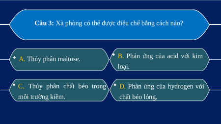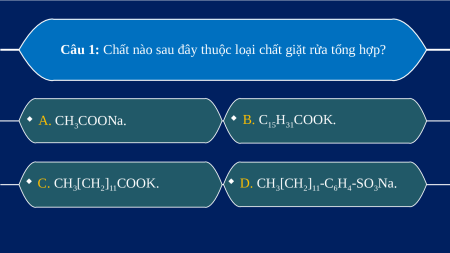 Câu 1: Chất nào sau đây thuộc loại chất giặt rửa tổng hợp? A. CH COONa. B. C H COOK. 3 15 31 C. CH [CH ] COOK. D. CH [CH ] -C H -SO Na. 3 2 11 3 2 11 6 4 3