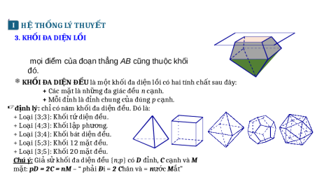 mọi điểm của đoạn thẳng AB cũng thuộc khối đó. KHỐI ĐA DI N Đ Ệ U Ề là m t kh ộ i đa d ố i n l ệ i có h ồ ai tính ch t sau đ ấ ây: + Các m t l ặ à nh ng ữ đa giác đ u ề n c nh. ạ + Mỗi đ nh l ỉ à đ nh ỉ chung c a đú ủ ng p c nh. ạ đ nh l ị ý: ch có năm kh ỉ i đa di ố n đ ệ u. Đó l ề à: + Lo i {3 ạ ;3}: Kh i t ố d ứ i n đ ệ u ề . + Lo i {4 ạ ;3}: Kh i l ố p ph ậ ng. ươ + Lo i {3 ạ ;4}: Kh i bát di ố n đ ệ u. ề + Lo i {5 ạ ;3}: Kh i 12 ố m t đ ặ u ề . + Lo i {3 ạ ;5}: Kh i 20 ố m t đ ặ u ề . Chú ý: Gi s ả kh ử i đ ố a di n đ ệ u { ề