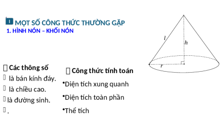 1. HÌNH NÓN – KHỐI NÓN l h r Các thông số